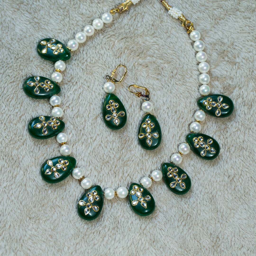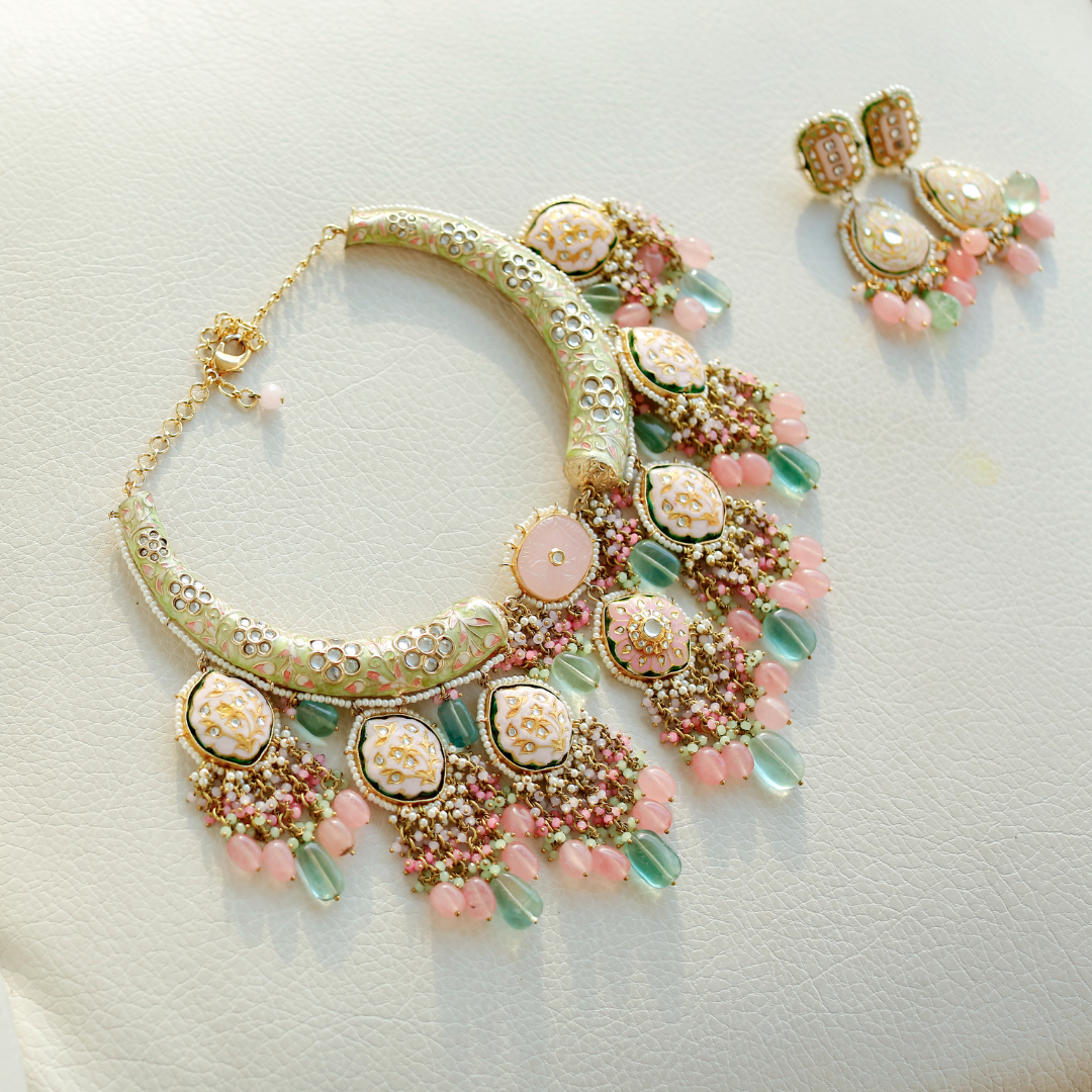 This gorgeous necklace set is crafted infusing cultural and spirituality into each piece, keeping in mind the auspicious nature of a wedding along with the need to adorn a bride in grand finery so that all eyes are on her. The charming earrings in antique finish can be easily worn in any big and small occasion after the wedding. definitely going to complement every color of your outfit and never cause a mismatc This is a perfect package to step into a new life with inherit traditions.